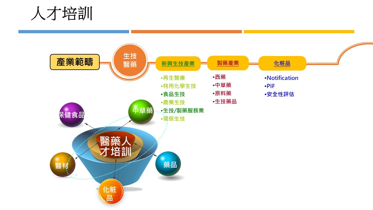 本中心以生技醫藥為核心,向外延伸至六大關聯領域。藥品、中草藥、醫療器材、化粧品、保健食品、新興生技產業。