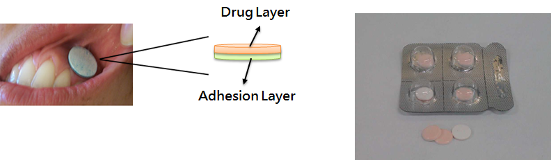 2.雙層貼錠,上層藥物藥物控釋層可使藥物持續釋放24小時;下層黏著層可使製劑黏著於口腔達24小時。