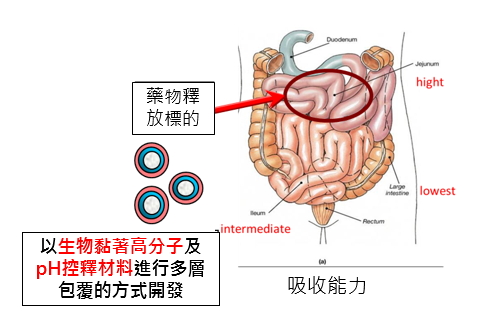 以pH值控釋之材料包覆藥物,促使藥物在標的吸收部位釋放。以生物黏著高分子將藥物在釋放後附著在腸壁,延長吸收時間。