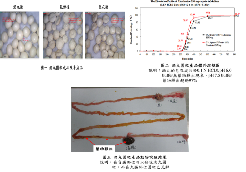 開發之產品藥物可以在0.1N HCl、pH 6.0 buffer中均不會釋出,在pH 7.5 buffer中藥物可以在2小時內快速釋出,此產品可以調控藥物在大腸(pH 7.5 buffer)的環境中藥物才會快速釋出,可以達到藥物標的釋放之目的。此技術將可以應用在需要在特殊環境釋出的藥物產品開發。