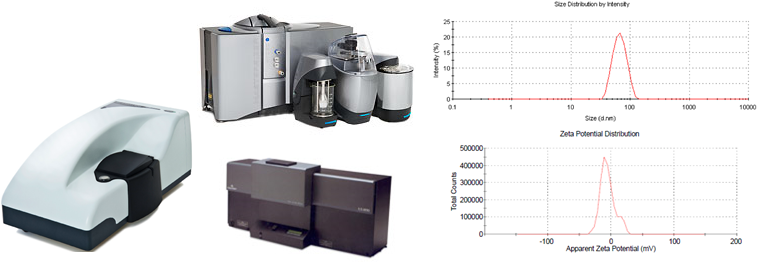奈米粒子會因表面性質、溶液 pH 值、電解質種類及溶液電解質濃度等,影響其表面電位,中心之設備應用Laser Doppler Micro-electrophoresis原理量測粒子表面 Zeta 電位,可作為膠體溶液系統穩定度判斷的指標。