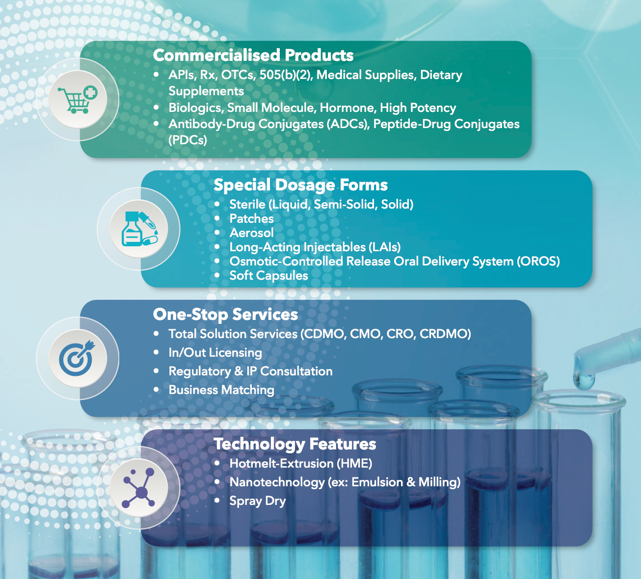 此外,TPA可依據國內外廠商需求,客製化商業合作模式,提供全面性、一站式服務,從前期藥品選題、共同研發、臨床試驗至終端生產皆能滿足。商業模式不限於/臨床委託研發製造/委託研發製造/ 委託製造(CrDMO/ CDMO /CMO)、臨床研究與分析(CRO)、 授權引進 (In-Out Licensing) 、技術授權 (Tech Transfer)等。