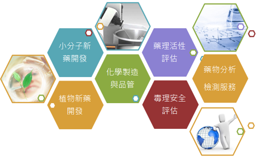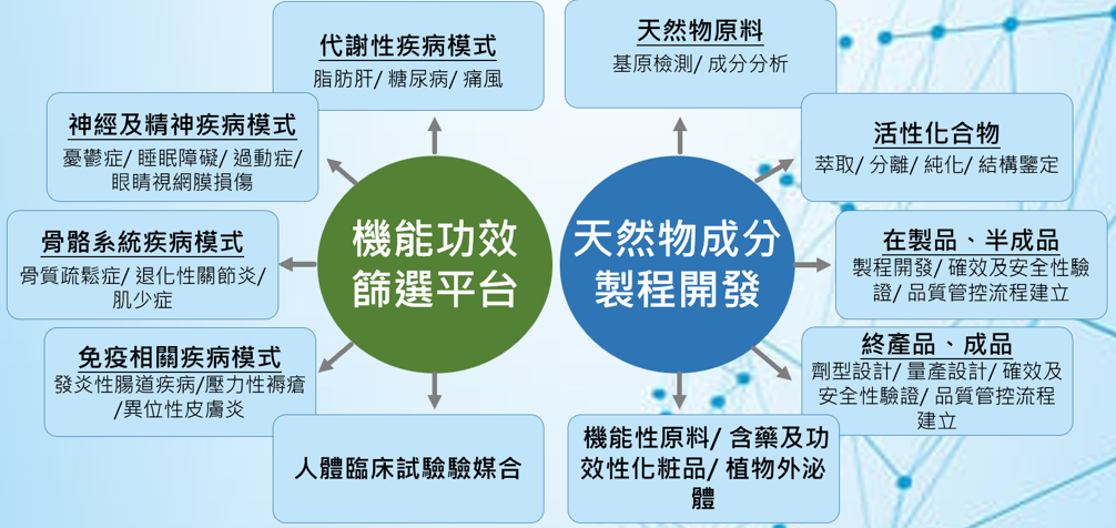 本處秉持生技醫藥產業價值鏈之一站式研發精神,進行新藥(植物新藥、小分子藥物、中藥)暨生技產品(保健食品、化粧品、香氛) 開發。