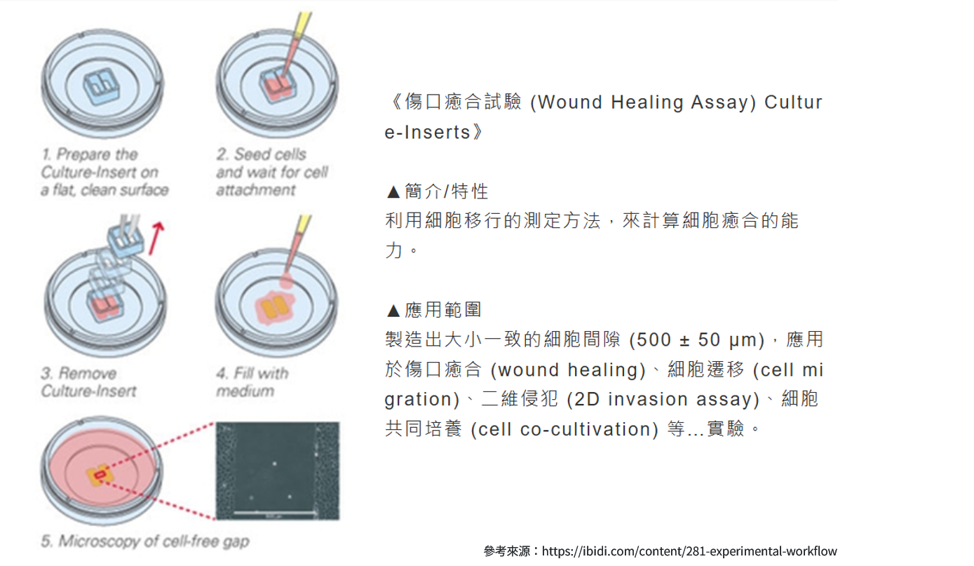 傷口癒合(Wound heaing):以Stoppers或Inserts隔絕出一圓形或gap,評估人類角質細胞HaCaT移動狀態。