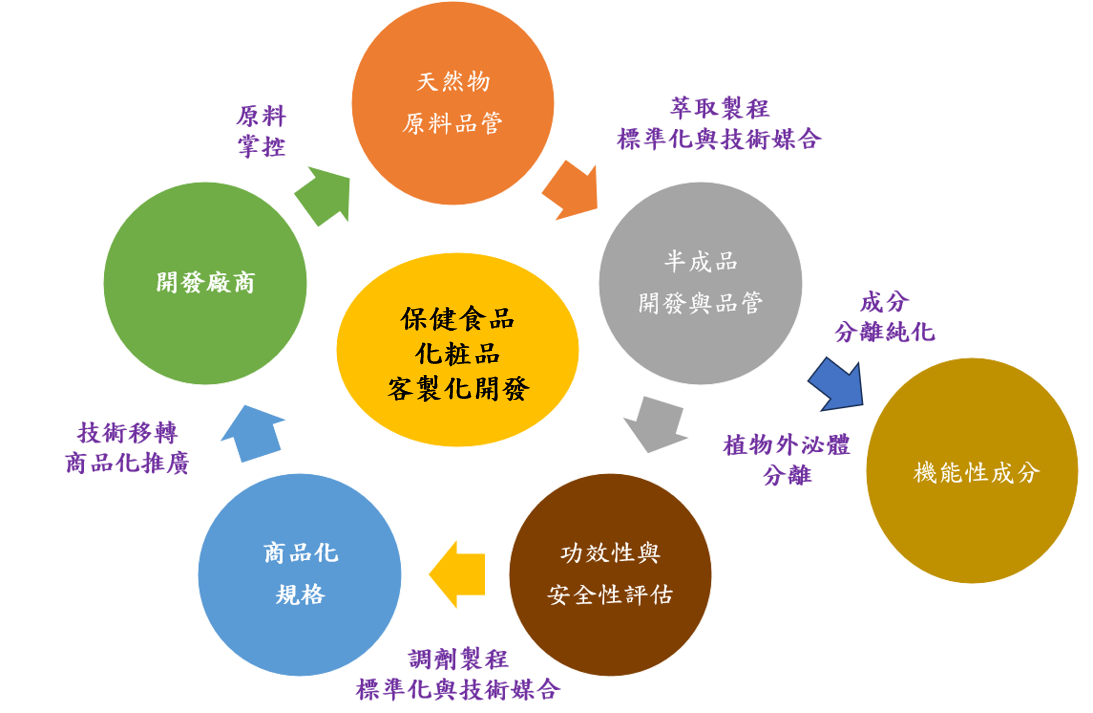 由原料的品管規格到萃取技術的標準化,延伸到半成品的品管規格到調製加工技術的標準化,完整的成品開發與法規諮詢。
